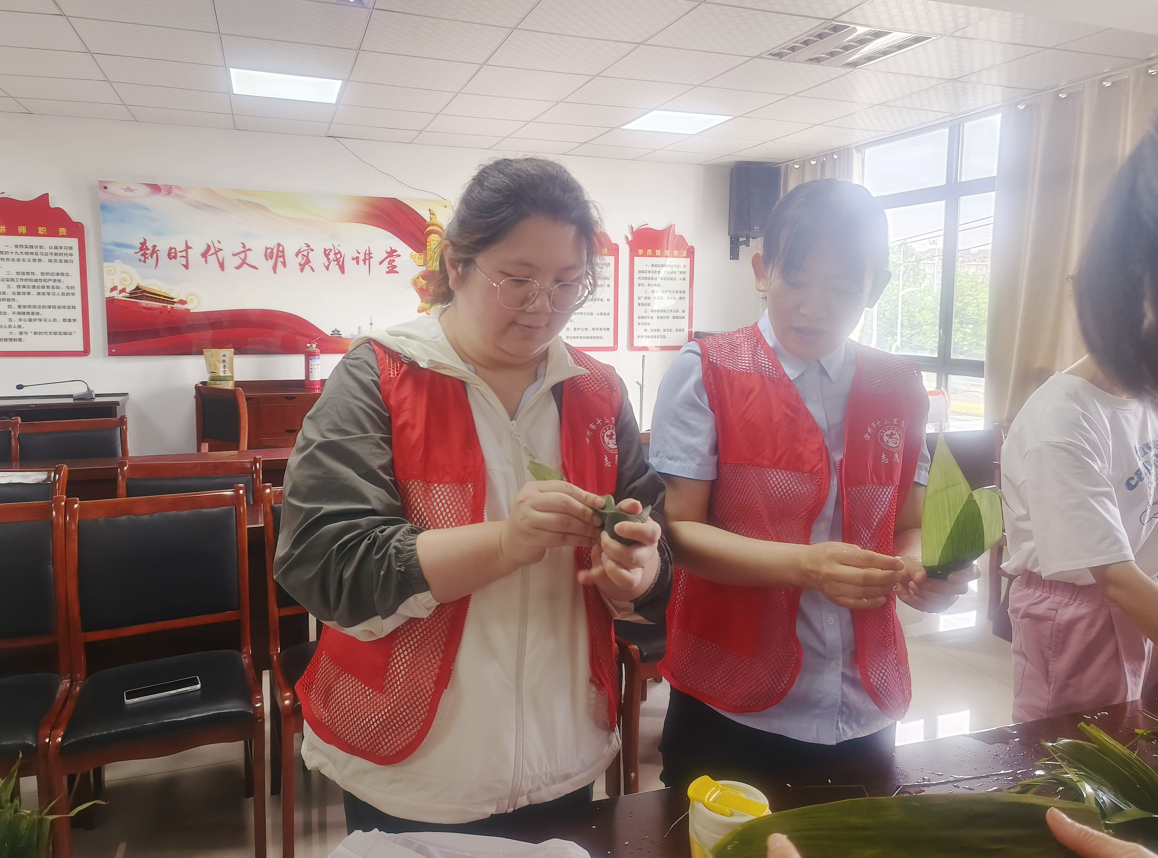 一年一端午,一歲一安康。活動伊始,志愿者向大家介紹了端午節(jié)的由來和習(xí)俗,讓大家感知端午節(jié)傳統(tǒng)文化的魅力。隨后,大家將提前浸泡好的糯米、粽葉等材料擺放在桌上,大家圍坐在一起相互交流包粽子的技巧和經(jīng)驗,分享彼此的生活趣事和快樂。大家分工合作,各顯所長,將粽葉挽成漏斗狀,填上糯米、餡料,再封口捆扎,將節(jié)日的祝福包裹進每一個粽子里,整個活動充滿了溫馨和歡樂。活動結(jié)束后,志愿者將包好的粽子分發(fā)給周邊的居民,用實際行動傳遞傳統(tǒng)節(jié)日的溫暖。