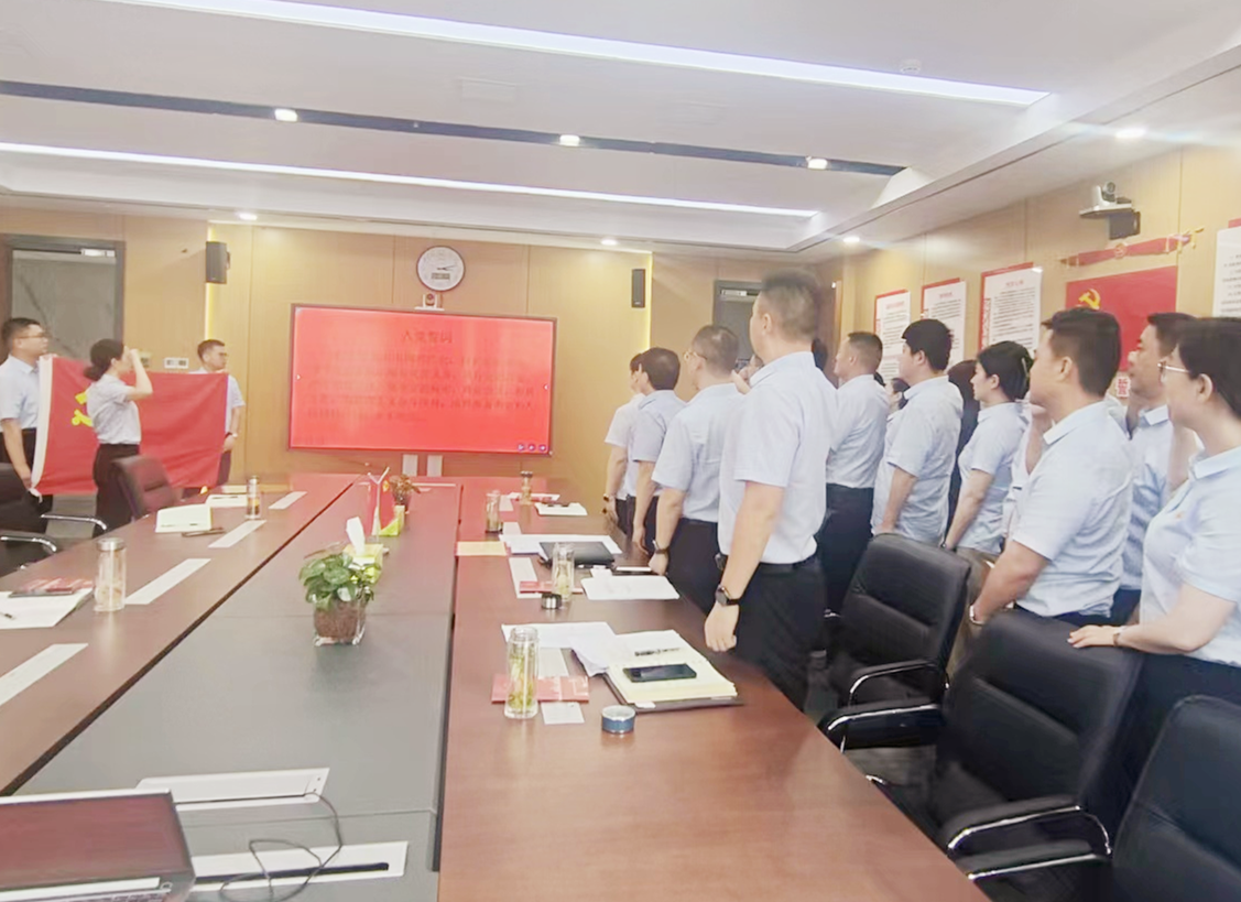 在優(yōu)秀黨員代表領誓下,全體黨員面對鮮紅的黨旗和莊嚴的誓詞,共同高舉右拳,莊嚴宣誓。鏗鏘有力的宣誓聲響徹會場,錚錚誓言提醒著黨員們永葆入黨初心,踐行使命擔當。
