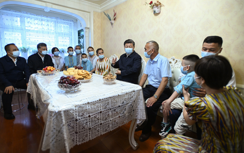 7月12日至15日,中共中央總書記、國家主席、中央軍委主席習近平在新疆考察。這是13日上午,習近平在烏魯木齊市天山區(qū)固原巷社區(qū),同維吾爾族居民阿布來提·吐爾遜一家人圍坐在一起拉家常。新華社記者 謝環(huán)馳 攝