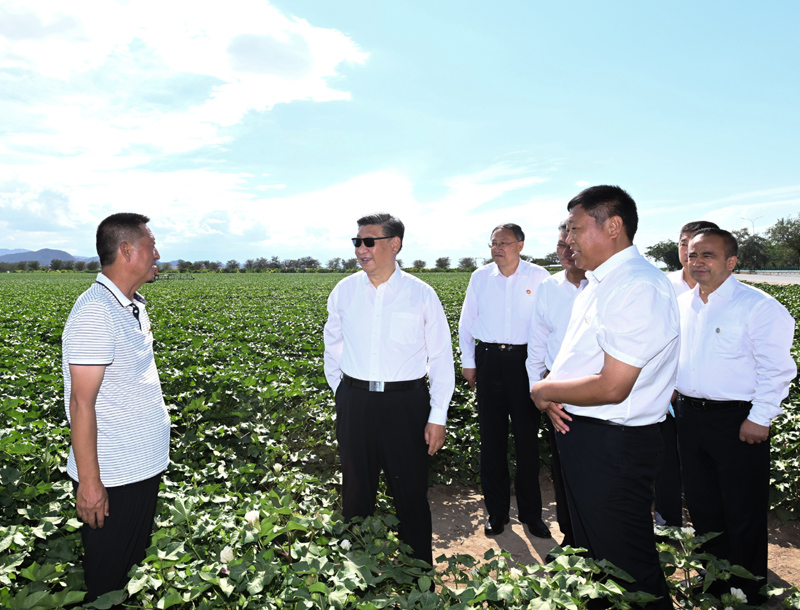 7月12日至15日,中共中央總書記、國家主席、中央軍委主席習近平在新疆考察。這是13日下午,習近平在新疆生產(chǎn)建設兵團八師一四三團農(nóng)一連棉花種植基地考察。新華社記者 謝環(huán)馳 攝