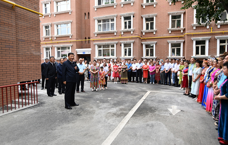 7月12日至15日,中共中央總書記、國家主席、中央軍委主席習近平在新疆考察。這是13日上午,習近平在烏魯木齊市天山區(qū)固原巷社區(qū)考察時,同各族群眾親切交流。新華社記者 謝環(huán)馳 攝